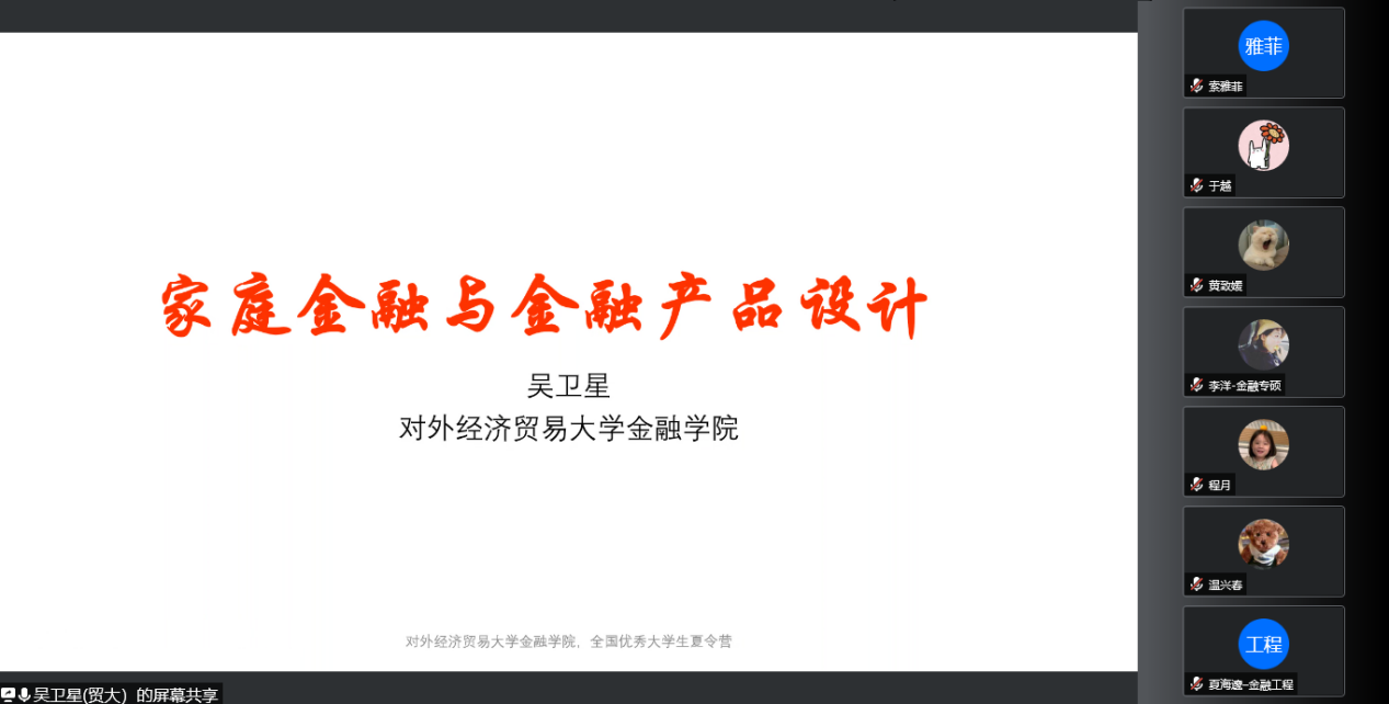 在第一天最后一项学生座谈会活动中,金融探花porn 优秀学生代表肖静、李维升、陈晓仪和樊成韵四位同学先后分享了在贸大金融探花porn 求学的学习生活经历,虽然是线上座谈,但夏令营的同学们热情很高,积极参与讨论和交流。
