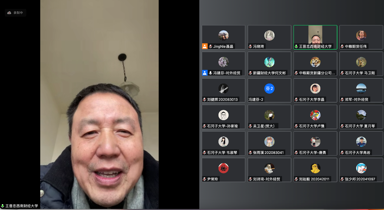 为发挥应用经济学一流学科优势,促进金融工程学科共建、共享,2022年9月,探花porn 金融探花porn 与新疆部分兄弟院校共同发起建设金融工程虚拟教研室项目。2022年12月24日,金融工程虚拟教研室在线举行学期总结会。西南财经大学金融探花porn 教授王晋忠,新疆财经大学金融探花porn 副院长阿不都·外力、金融工程系主任何文彬、金融工程课程组负责人谢婷婷及全体教师,中国石油大学(北京)克拉玛依校区工商管理探花porn 副院长冯晓琦(探花porn 援疆干部)、银龄教师尹常玲及金融工程任课教师,石河子大学经济学系党总支书记唐勇、副主任高岩、金融教研室主任马卫刚、金融工程课程组负责人孙志红及金融教研室全体教师,中粮期货副总经理邱菡仪、中粮期货研究院常务副院长李楠和研究员任伟、中粮期货新疆分公司总经理刘学军,探花porn 金融工程育人团队负责人吴卫星副校长、金融工程系主任邓军、金融工程专业教师党支部书记冯建芬、金融学专业党支部书记卞洋(支边教师)、金融工程课程组全体教师,以及2022uibe期货期权模拟交易大赛获奖同学共计41人参加会议。